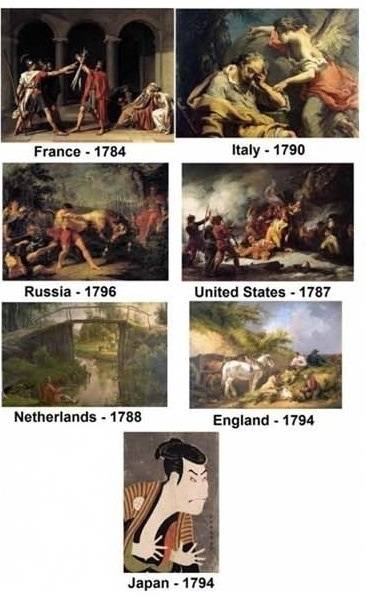 上記画像はネットでよく見かける「同じ年代の日本と西洋の絵画比較」の画像です。